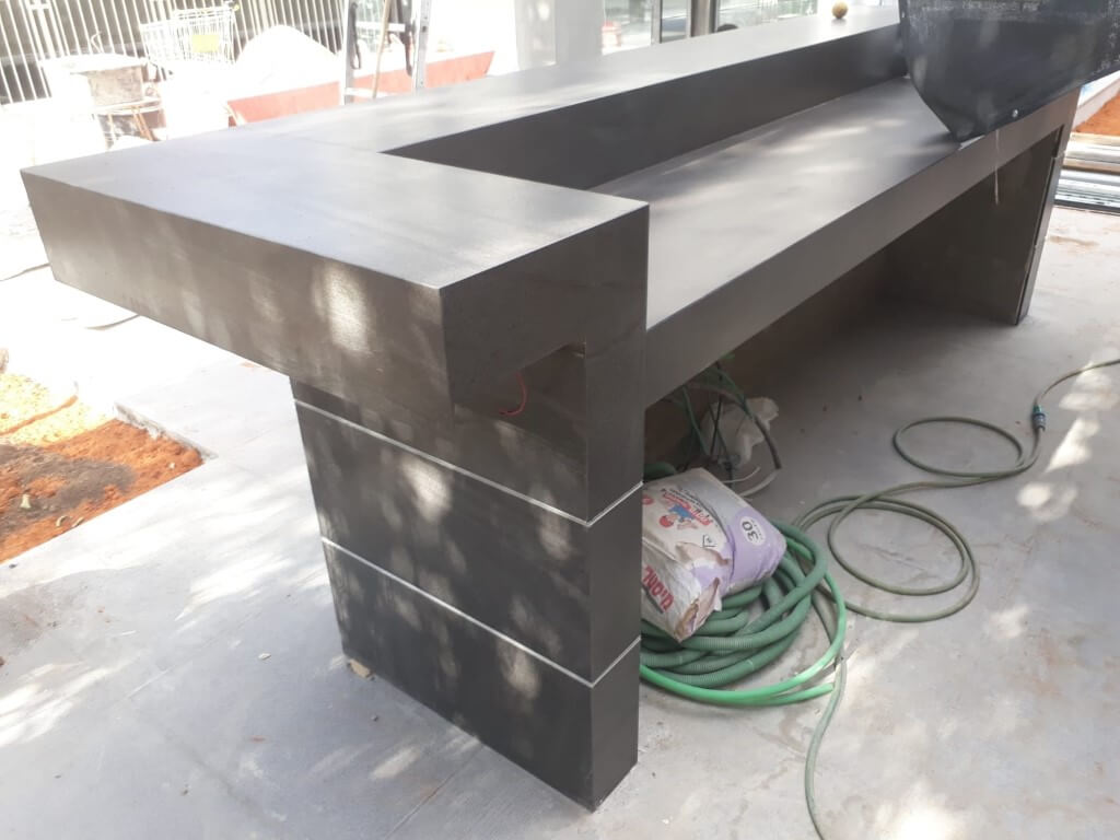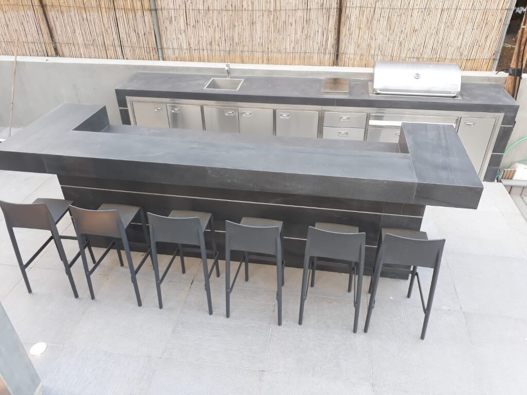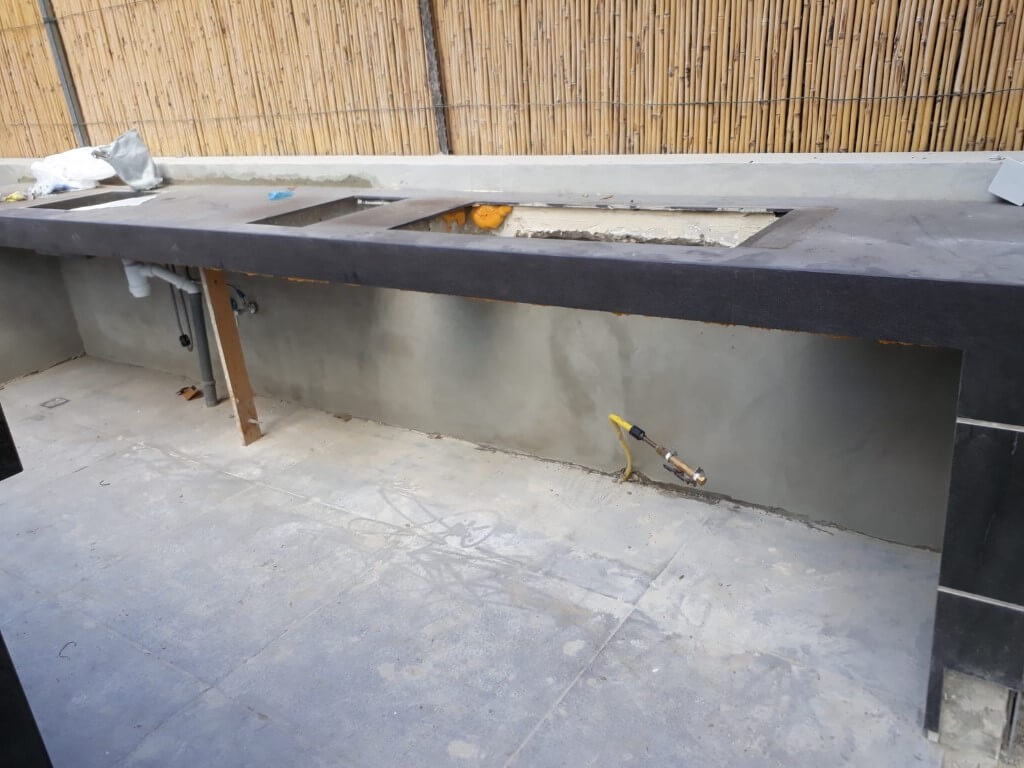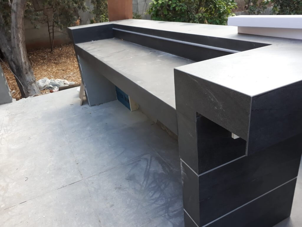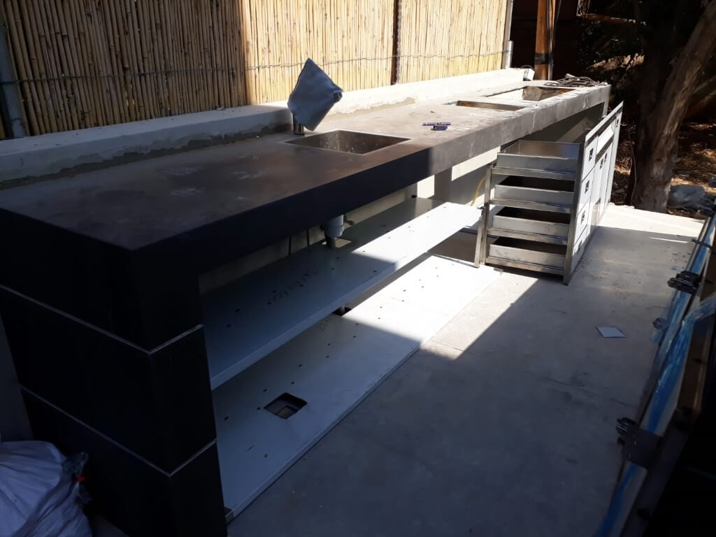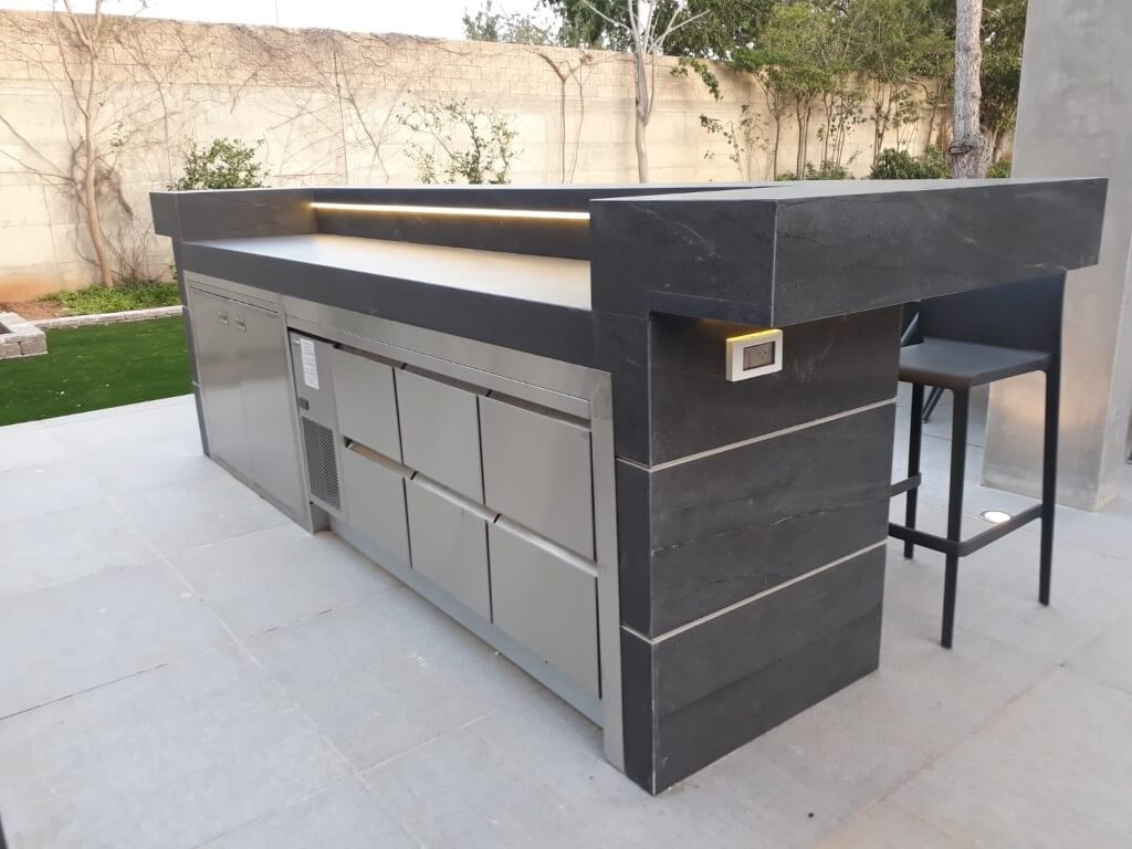 מטבח החוץ מתחיל לקבל צורה לאחר התקנת השיש ושילוב פסי דקור אלומיניום.