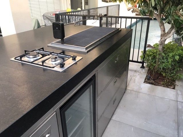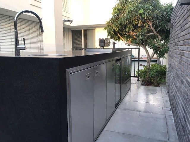חיפוי חיצוני שיש עמיד בכל תנאי מזג האויר, מאובזר בגריל גז סופר מקצועי 9 מבערי גז תפוקת חום עד 120000 Btu + אפשרות להוספת פחמים+חיישני בטיחות מבית שאולי, כיור, מקרר, כירת גז ושיפוד מסתובב ועוד…