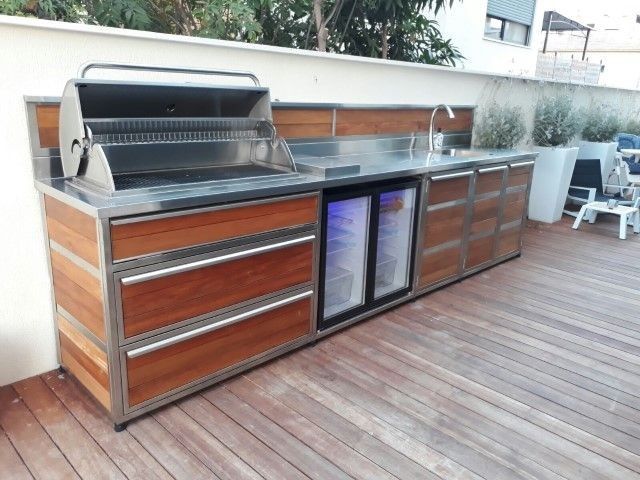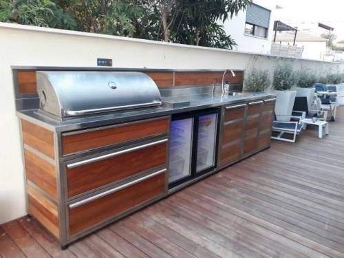 מטבח חוץ נירוסטה בחיפוי סרגלי איפאה .משולב גריל גז מבית שאולי גרילס בעל 9 מבערים תעשיתיים + אפשרות להוספת פחם וחיישני בטיחות.